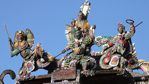 廟內門壁的石質浮雕、梁柱的木雕彩繪,都具有很高的審美價值,特別是一對由整塊石頭雕刻的透雕盤龍柱石,上有八仙立像,工藝十分高超,過去只有在皇宮和孔廟才能見到。屋頂的嵌瓷藝術,是潮汕工藝特有的技巧。用燒制好的彩色陶瓷片,拼制出各種戲文圖案,人物栩栩如生,又不怕風雨的侵蝕。